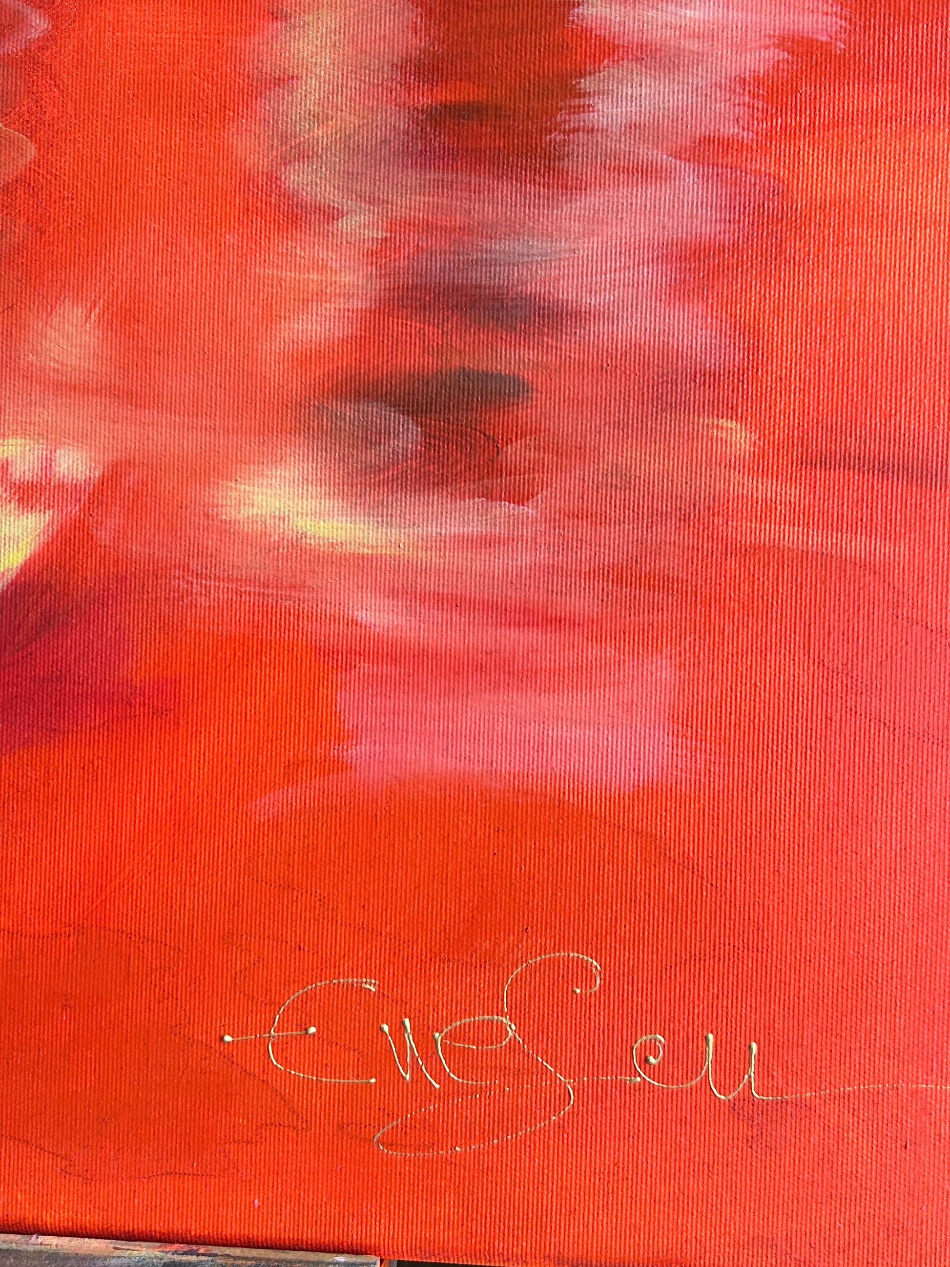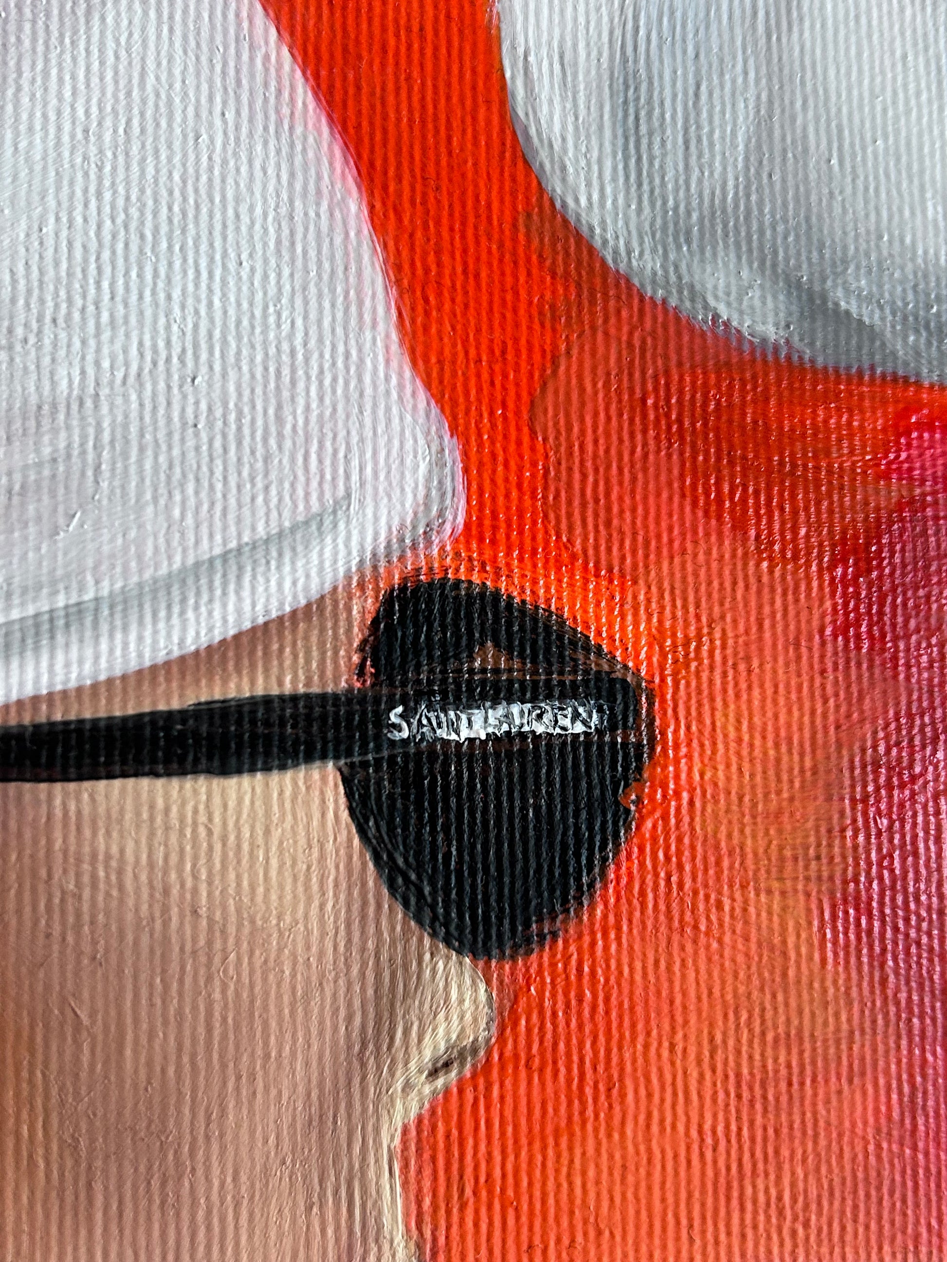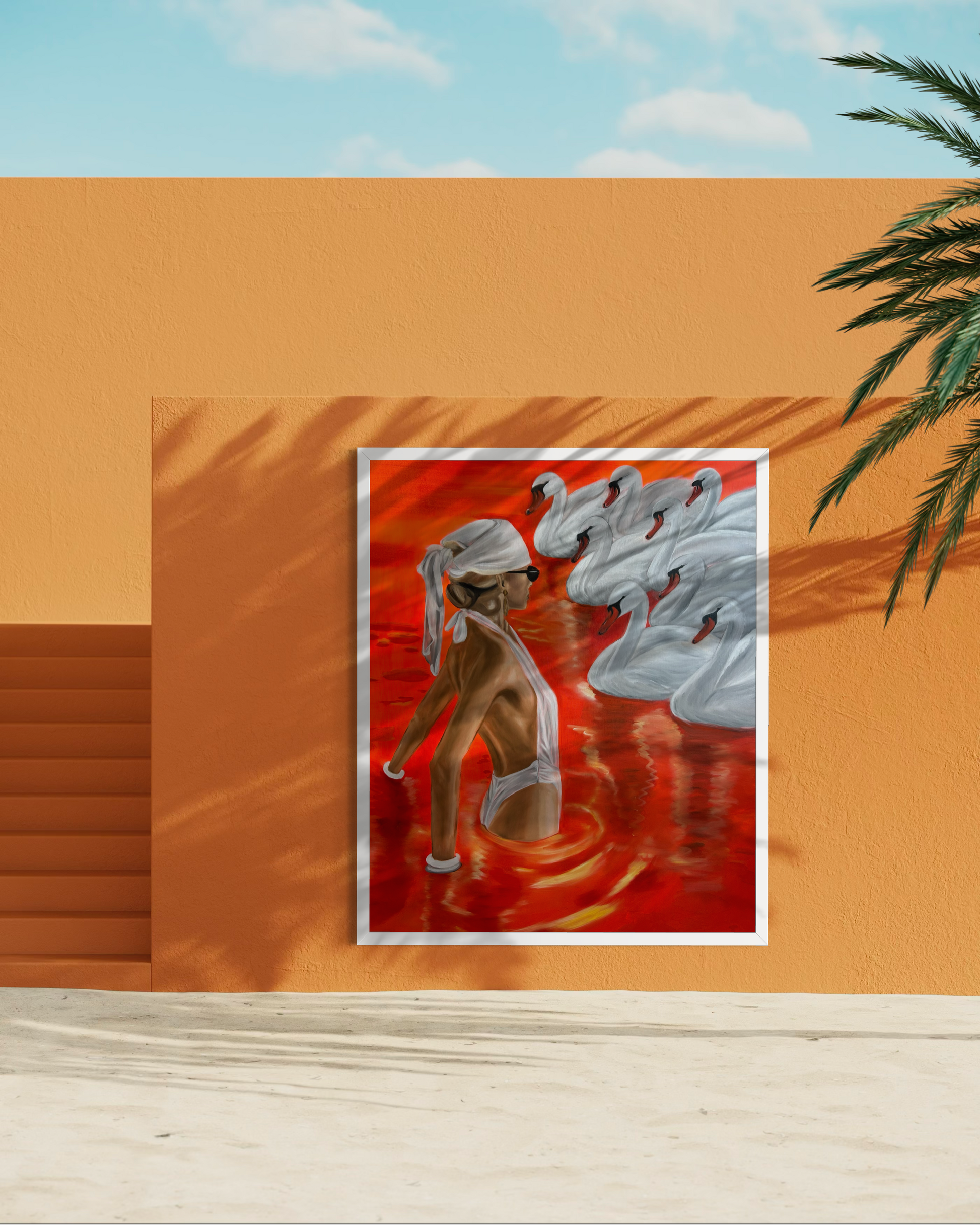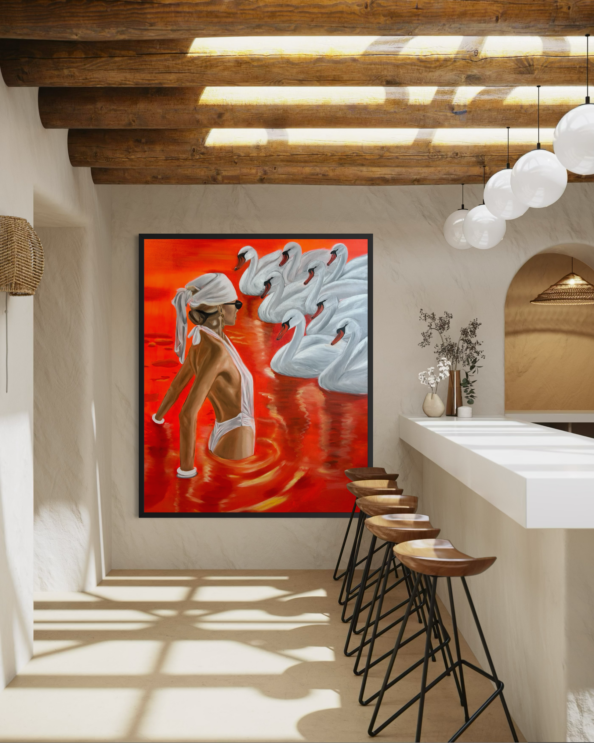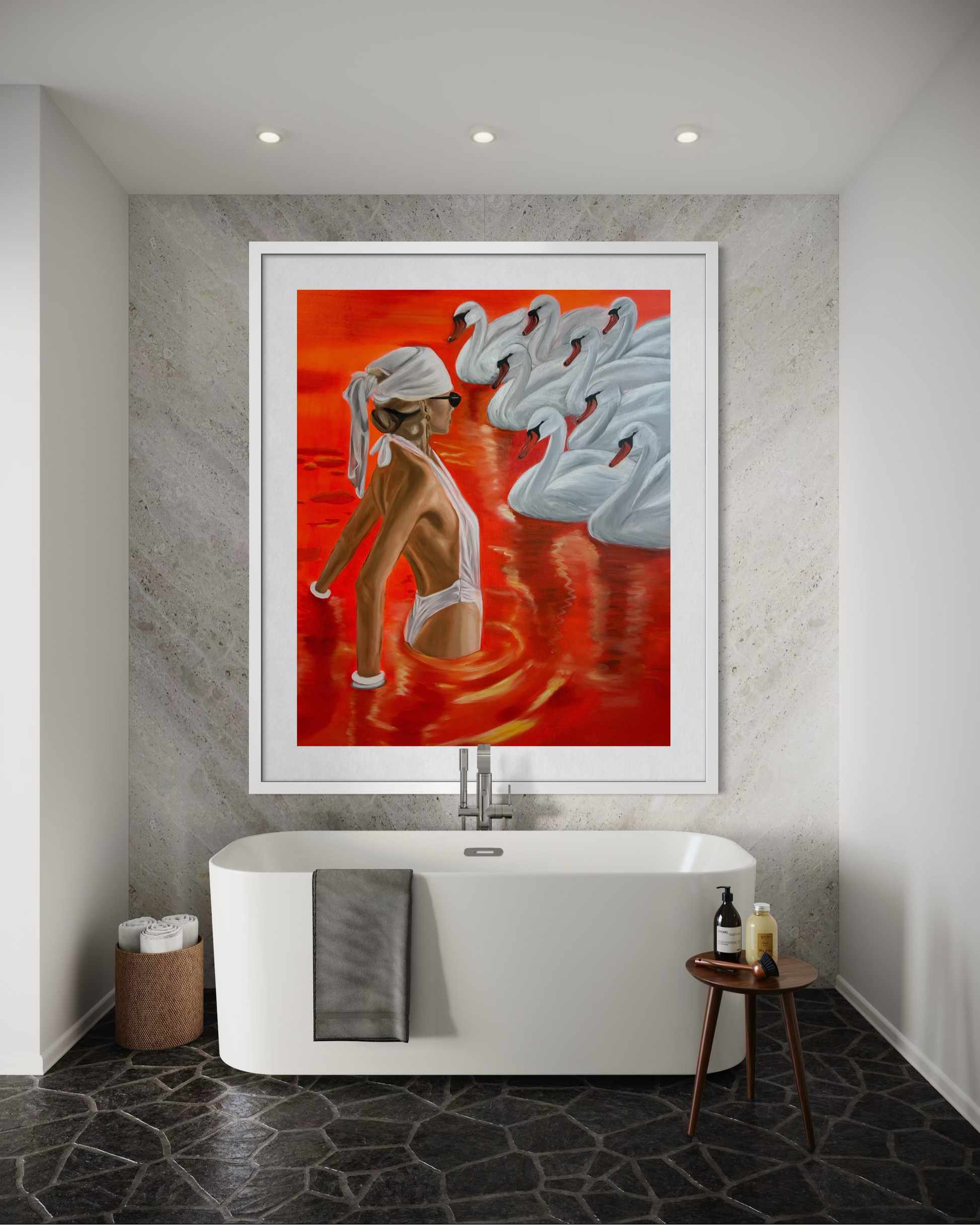 Experience a moment of profound connection with "A Quiet Encounter," an original oil painting on canvas. This captivating piece depicts a solitary woman entering tranquil waters, embraced by the calm curiosity of gathering white swans. The use of warm orange and red tones imbues the scene with vibrant energy and emotional depth, transforming the water into a living reflection of feeling and atmosphere.
