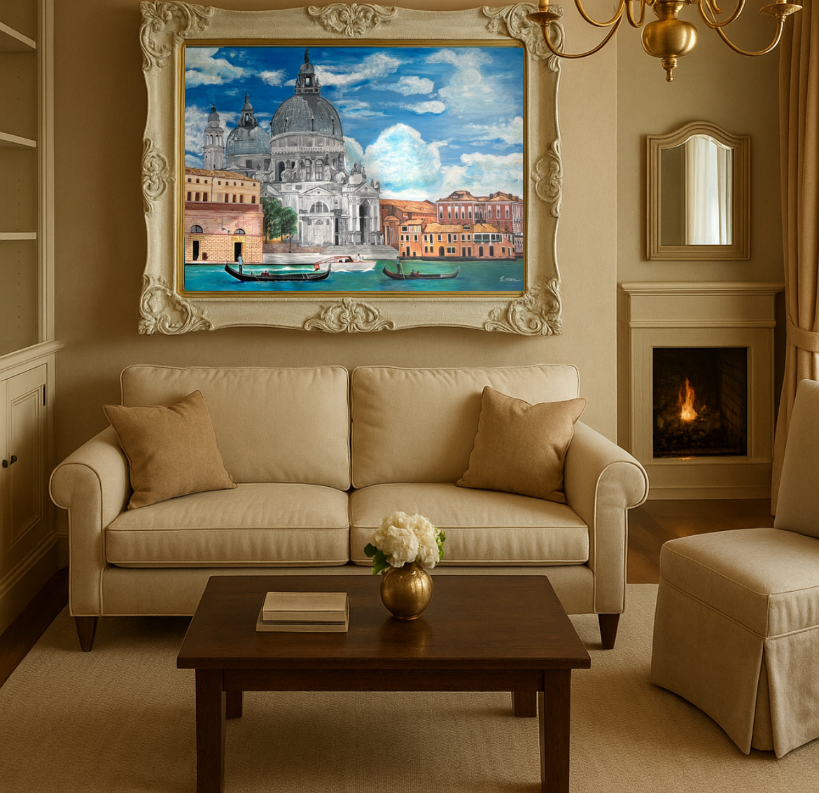 Captured in vibrant hues and delicate brushwork, this painting transports you to the heart of Venice, where gondolas glide gracefully and the majestic Basilica stands proudly under a luminous sky.